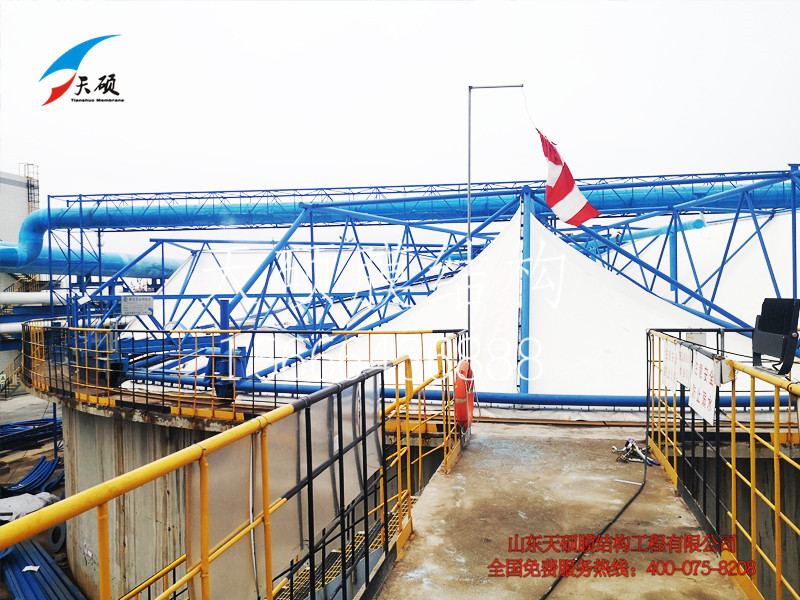 1.廢氣收集效果好;污水池膜加蓋是一種新型的廢氣收集裝置,將膜材作為蓋板,污水池四周用鋼架支撐,將膜材反吊在污水池上,通過池內廢氣處理裝置的作用,將廢氣凈化之后,排出池外,廢氣收集效果好;